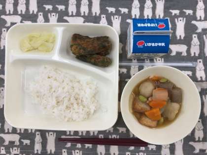本日の献立は、ちくわの磯部揚げ、厚揚げと里芋の煮物、あっさりキャベツ、ごはん、牛乳です。