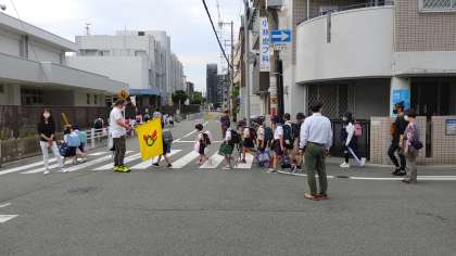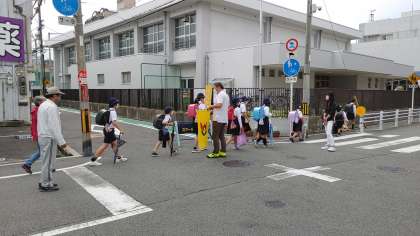 月曜日の朝です。地域の皆様に見守られながら、子どもたちが元気に集団登校してきました。