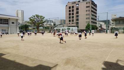 給食をいただいて、おなか一杯になった後は、運動場で元気に遊びます。