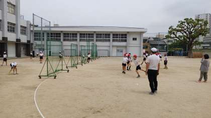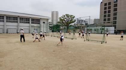 今日の午前中の5年生体育の授業では、ソフトボール投げの練習をしていました。