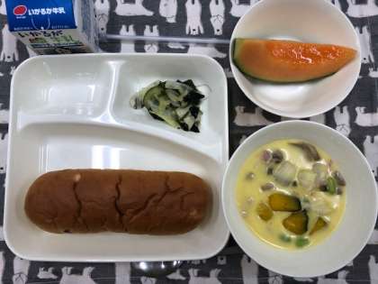 本日の献立は、かぼちゃのクリームシチュー、ミックス海藻のサラダ、おさつパン、牛乳、クインシーメロンです。
