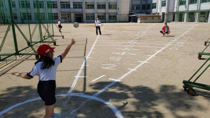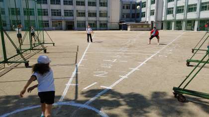 1時間目、いよいよソフトボール投げテストが始まりました。