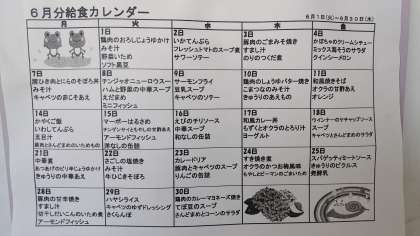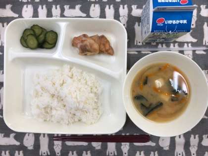 本日の献立は、鶏肉の醤油バター焼き、小松菜の味噌汁、きゅうりの和え物、ごはん、牛乳です。