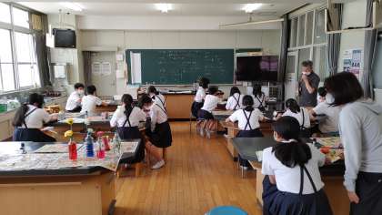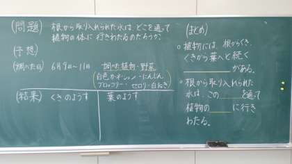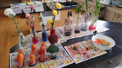 白色のカーネーションが、吸い上げる水の色を変えると花の色が変わっていることが分かります。