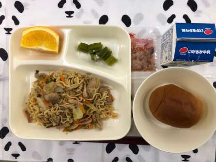 本日の献立は、和風焼きそば、オクラの甘酢和え、黒糖小パン、オレンジ、牛乳です。