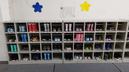 1年生の下駄箱も色とりどりの長靴が並んでいます。