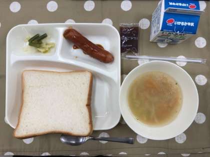 本日の献立は、ウインナーのケチャップソース、スープ、キャベツと三度豆のサラダ、食パン、イチゴジャム、牛乳です。