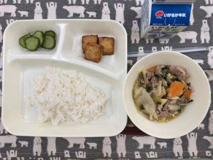 本日の献立は、中華煮、厚揚げのピリ辛醤油かけ、きゅうりの中華和え、ごはん、牛乳です。