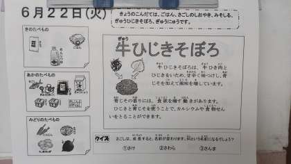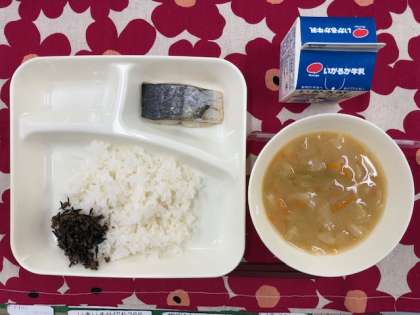 本日の献立は、さごしの塩焼き、みそ汁、牛ひじきそぼろ、ごはん、牛乳です。