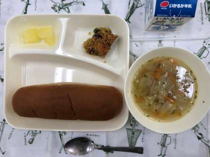 本日の献立は、カレードリア、豚肉とキャベツのスープ、黒糖パン、りんごの缶詰、牛乳です。