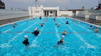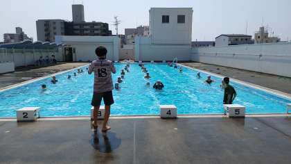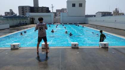 水泳時はマスクを取るので、しっかりと間隔をとっています。