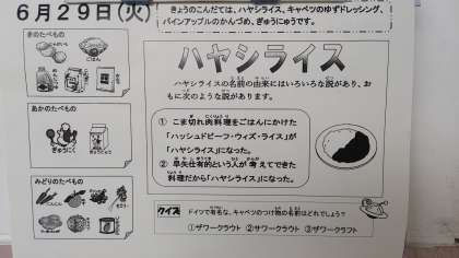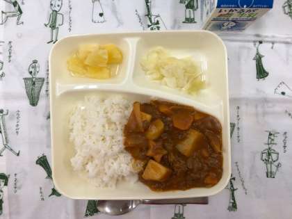 本日の献立は、ハヤシライス、キャベツのゆずドレッシング、パインアップルの缶詰、牛乳です。