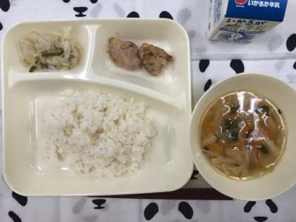 本日の献立は、鶏肉の醤油マヨネーズ焼き、切り干し大根のゆずの香和え、五目汁、ごはん、牛乳です。