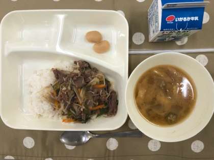 本日の献立は、牛丼、冬瓜の味噌汁、白花豆の煮物、牛乳です。