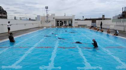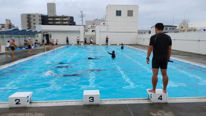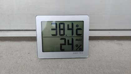6時間目にはプールサイドはこの気温になりました。しっかり水分補給をしながらの水泳の授業です。