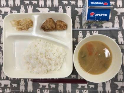 豚肉の香味揚げ、みそ汁、もやしのおひたし、ごはん、牛乳です。