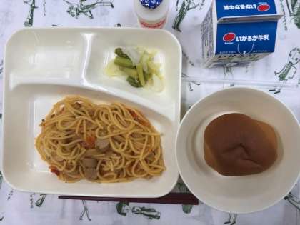 本日の献立は、チキントマトスパゲッティ、グリーンアスパラとキャベツのサラダ、黒糖ぱん(小)、牛乳、発酵乳です。