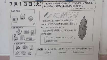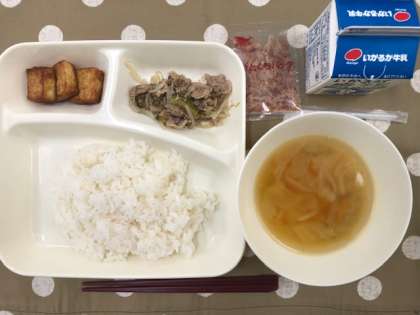 本日の献立は、ゴーヤチャンプルー、厚揚げの生姜醤油かけ、すまし汁、ごはん、牛乳です。