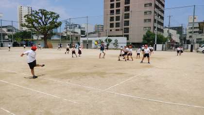 給食を食べた後は、担任の先生も一緒に元気にドッヂボールです。