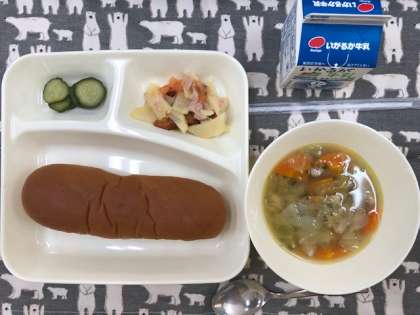 本日の献立は、ジャガイモとトマトのチーズ焼き、きゅうりのサラダ、鶏肉とてぼ豆のスープ煮、パン、牛乳です。