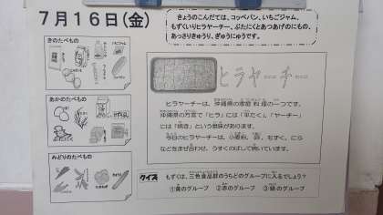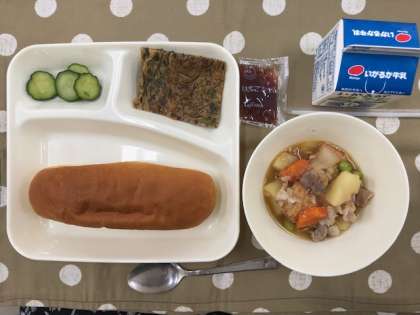 本日の献立は、もずく入りヒラヤーチー、豚肉と厚揚げの煮物、あっさりきゅうり、パン、イチゴジャム、牛乳です。