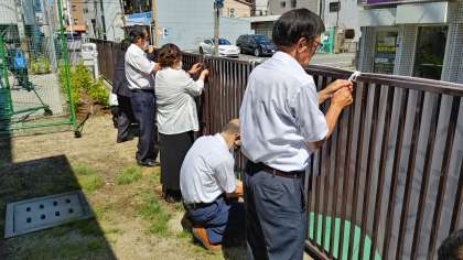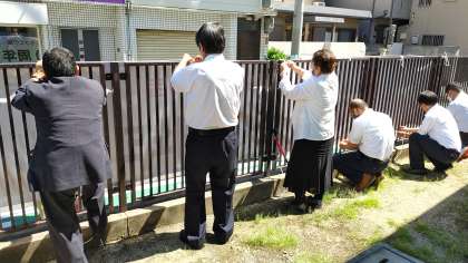 本日ご出席いただいた創立150周年記念事業委員会(元会長会)の皆様に、横断幕の取り付けひもを1箇所ずつ結んでいただきました。