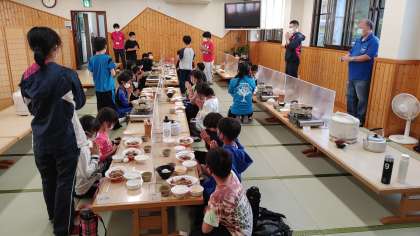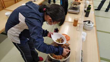 コロナ対策のため、あらかじめ食事係が取り分けます。