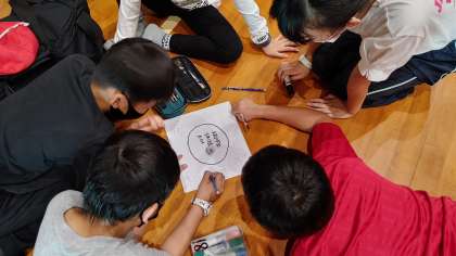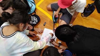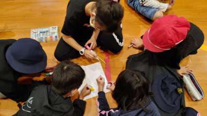 色紙に、アサヒロッジのみなさまへの感謝の気持ちを寄せ書きしています。