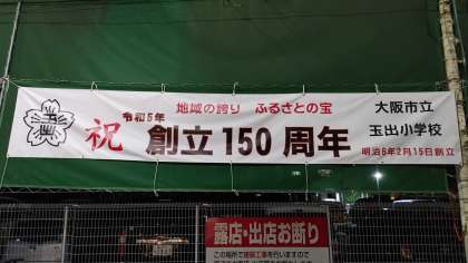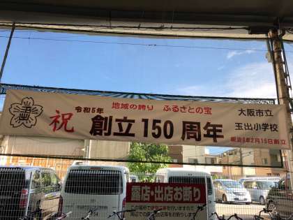 7月21日(水)に玉出小学校の北側柵沿いに掲げていただいた「創立150周年記念横断幕」を玉出商店街にも掲げてくださいました。ぜひご覧ください。
