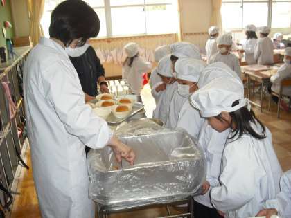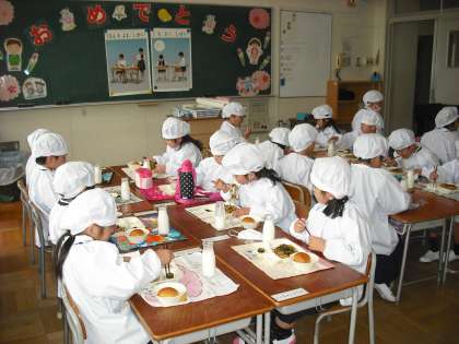 小学校に入って初めての給食は、焼きそばときゅうりの中華あえでした。給食服もばっちり、お手伝いをしたくてたまらない1年生でした。