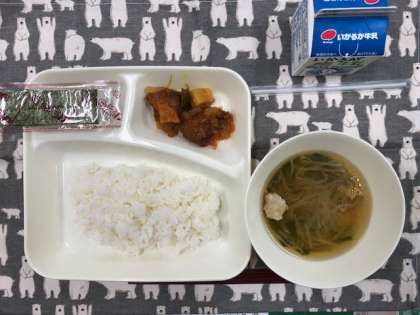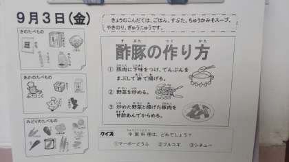 本日の献立は、酢豚、中華味噌スープ、ごはん、焼きのり、牛乳です。
