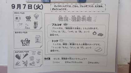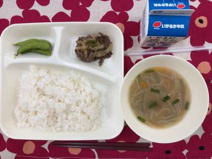本日の献立は、プルコギ、トック、枝豆、ごはん、牛乳です。