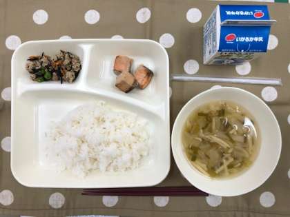 本日の献立は、鮭の醤油風味焼き、高野豆腐の炒り煮、五目汁、ごはん、牛乳です。