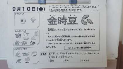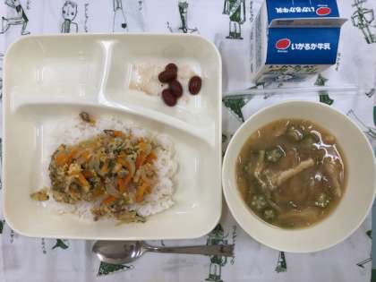 本日の献立は、他人丼、冬瓜の味噌汁、金時豆の煮物、牛乳です。