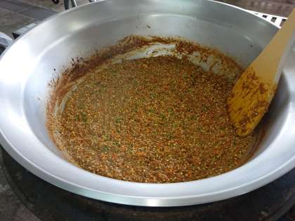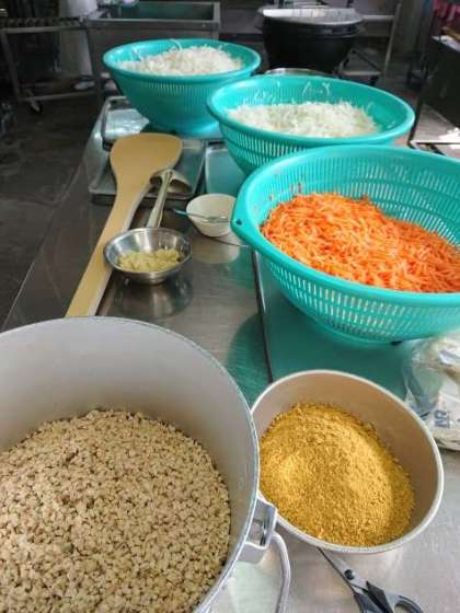 調理室で大豆入りキーマカレーライス(米粉)を作っている様子です。