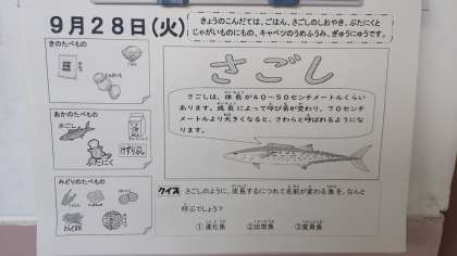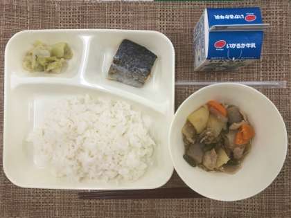 本日の献立は、さごしの塩焼き、豚肉とじゃがいもの煮物、キャベツの梅風味、ごはん、牛乳です。