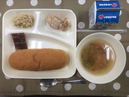 本日の献立は、鶏肉のから揚げ、切り干し大根の胡麻辛味づけ、冬瓜の中華スープ、コッペパン、イチゴジャム、牛乳です。