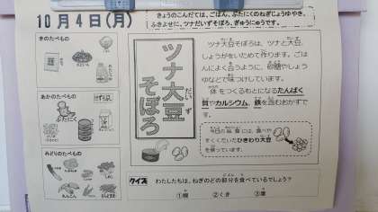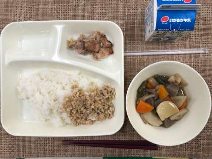 本日の献立は、豚肉のネギ醤油焼き、吹き寄せ煮、ツナ大豆そぼろ、ごはん、牛乳です。