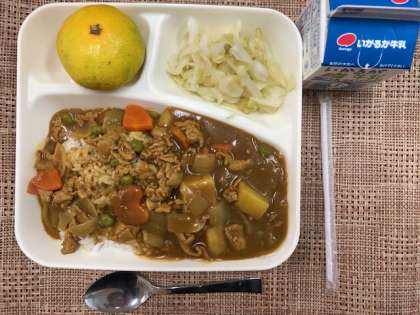 本日の献立は、ポークカレーライス(米粉)、キャベツのピクルス、みかん、牛乳です。