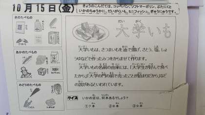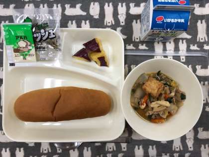 本日の献立は、豚肉とイカの中華煮、大学いも、コッペパン、ソフトマーガリン、ミニフィッシュ、牛乳です。