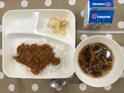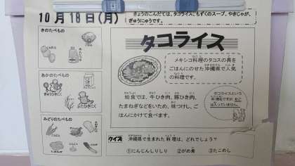 本日の献立は、タコライス、もずくのスープ、焼きじゃが、牛乳です。