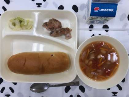 本日の献立は、鶏肉の香草焼き、キャベツのガーリックソテー、ウインナーとてぼ豆のスープ、おさつパン、牛乳です。