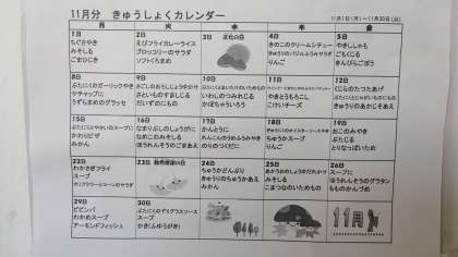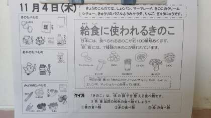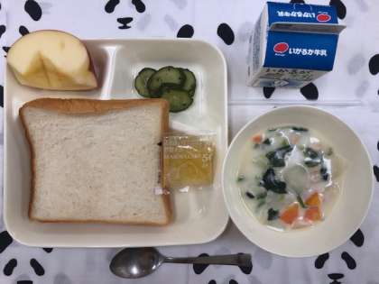 本日の献立は、きのこのクリームシチュー、きゅうりのバジル風味サラダ、食パン、マーマレード、りんご、牛乳です。
