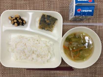 本日の献立は、さごしのおろし醤油かけ、里芋のすまし汁、大豆の煮物、ごはん、牛乳です。