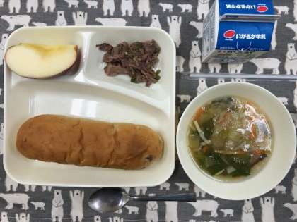 本日の献立は、牛肉のオイスターソース焼き、中華スープ、レーズンパン、りんご、牛乳です。