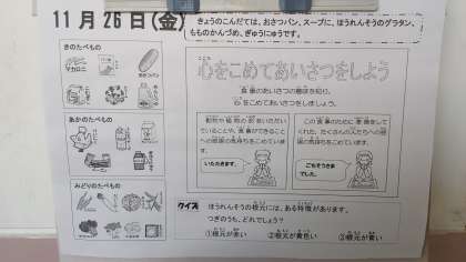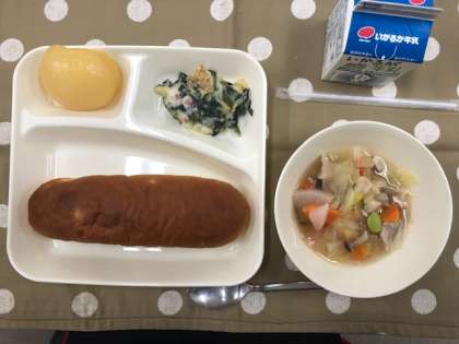 本日の献立は、ほうれん草のグラタン、スープ煮、おさつパン、桃の缶詰、牛乳です。