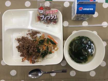 本日の献立は、ビビンバ、わかめスープ、アーモンドフィッシュ、牛乳です。