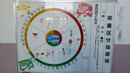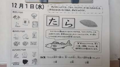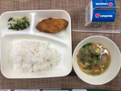 12月最初の給食は、たらフライ、菊菜と白菜の胡麻和え、さつまいもの味噌汁、ごはん、牛乳です。
