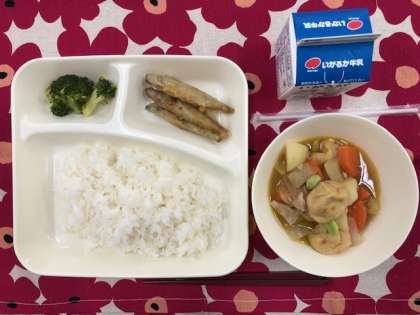 本日の献立は、きびなご天ぷら、一口がんもとじゃがいもの煮物、ブロッコリーの生姜漬け、ごはん、牛乳です。