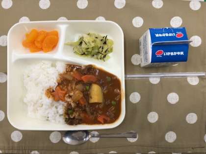 本日の献立は、ハヤシライス、キャベツのひじきドレッシング、みかんの缶詰、牛乳です。
